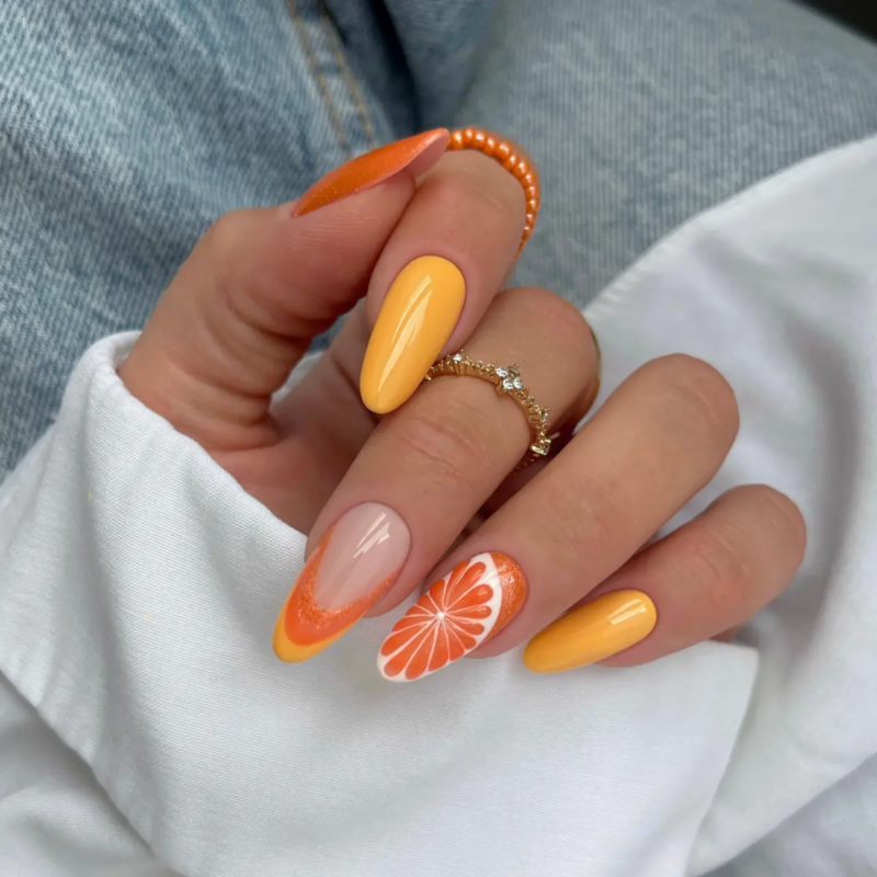 Wystarczy półtransparentna lub mleczna baza, a na końcówkę odrobina koloru cienka, lekka kreska, która zmienia całą stylizację. A jeśli lubisz błysk, ale w wersji „na miękko”, dodaj cienką linię brokatu albo warstwę topu z drobinkami. Efekt? Letnia elegancja z odrobiną zabawy.