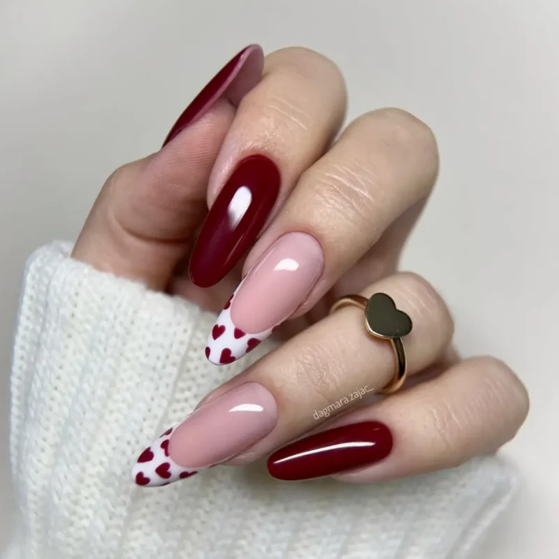 Nie ma bardziej walentynkowego koloru niż czerwień. To odcień, który symbolizuje miłość, namiętność i odwagę. Czerwone paznokcie to zawsze klasyczny wybór, elegancki i ponadczasowy. Możesz postawić na intensywną czerwień, głęboką tonację o winnych nutach lub subtelne przejścia ombre z różem.