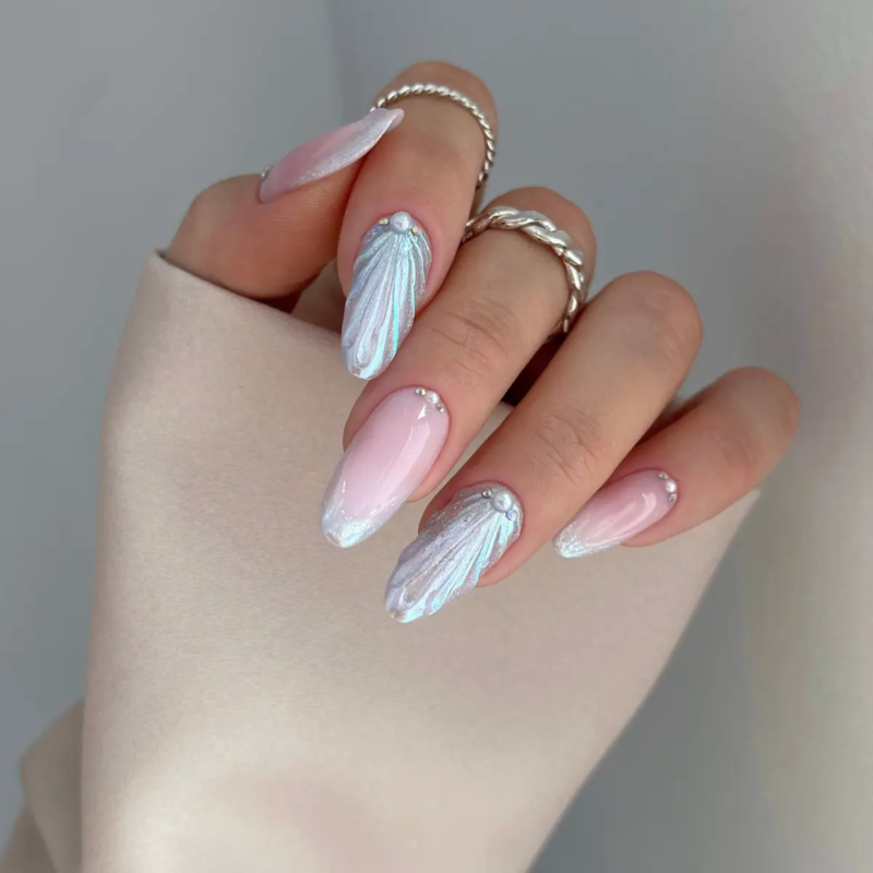 Wyobraź sobie świat pełen błękitów, opalizujących powierzchni i świetlistych refleksów, jakby ktoś zamknął w butelce letni zachód słońca nad wodą. Mermaidcore w stylizacji paznokci to połączenie delikatnych kolorów: błękitów, fioletów, seledynów i różów z efektami, które odbijają światło jak łuski syreny. Perła, szkło, brokat, cat eye, flash wszystko mieni się inaczej w zależności od kąta patrzenia.