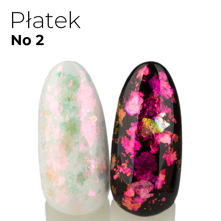 1. Delikatny, pastelowy blask: Płatki No. 2 wyróżniają się subtelniejszym wykończeniem w porównaniu do bardziej intensywnych efektów No. 3, co czyni je idealnymi do eleganckich i delikatnych stylizacji.