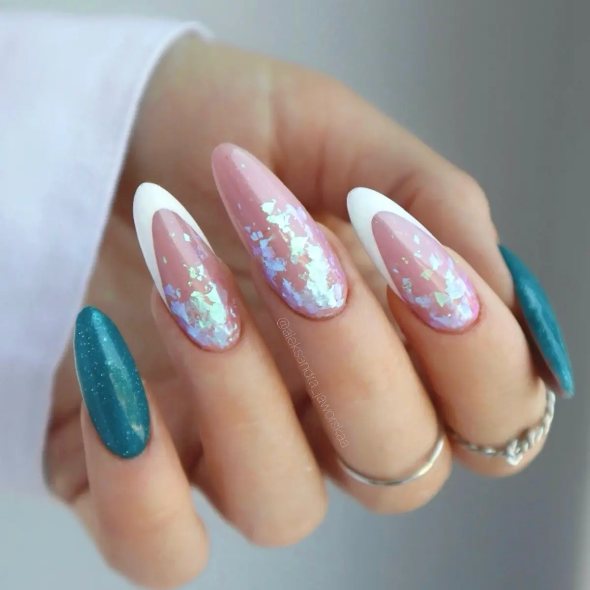 3. Aplikuj płatki: Za pomocą aplikatora, pędzelka lub palca nałóż płatki na powierzchnię paznokcia. Rozłóż je równomiernie lub twórz artystyczne wzory.